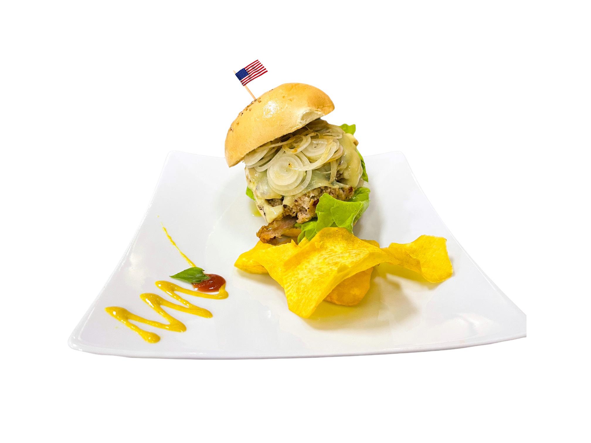 Hamburguesa de pollo 170g, salsa pesto, bacón, queso gouda, lechuga, tomate y cebolla salteada